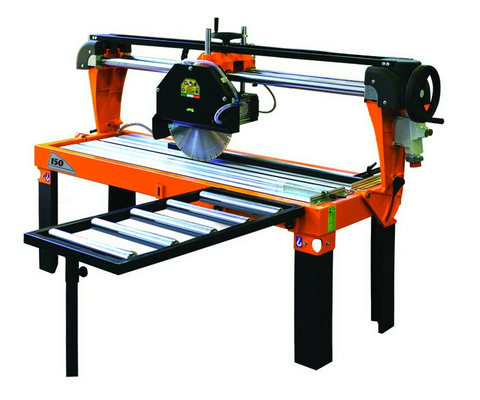 Robust, versatile and inexpensive Saw with an extremely accurate cutting. The head slides on two chromium-plated ground bars by means of linear ball-bearings. The cutting head is controlled by traction belts and it is driven by a handwheel positioned by “the operator’s place”. The machine is equipped with a submersible pump placed inside the base to collect the water cooling the blade. Vertical head motion by means of a handwheel for a fast and stable adjustment. Tilting head for 45° cuts; Angle legs.